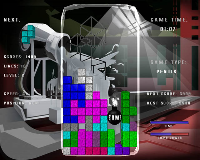 This game is yet another 3D remake of one of the best all-time classics in the history of PC games - Tetris. BUT it is in fact LIKE NO OTHER! It's got absolutely fantastic 3D industrial style graphics, it's got 5 different game types to suit any kind of player: Revolution, Pentix, Emptix, Kids and Retro, it's got superb stereo sound. Well, it's got pretty much everything you can think of: various shapes of blocks, numerous bonuses, explosives to get rid of unwanted blocks, etc. This will change your idea of what a proper tetris game should be like. A real revolution in the Tetris world!